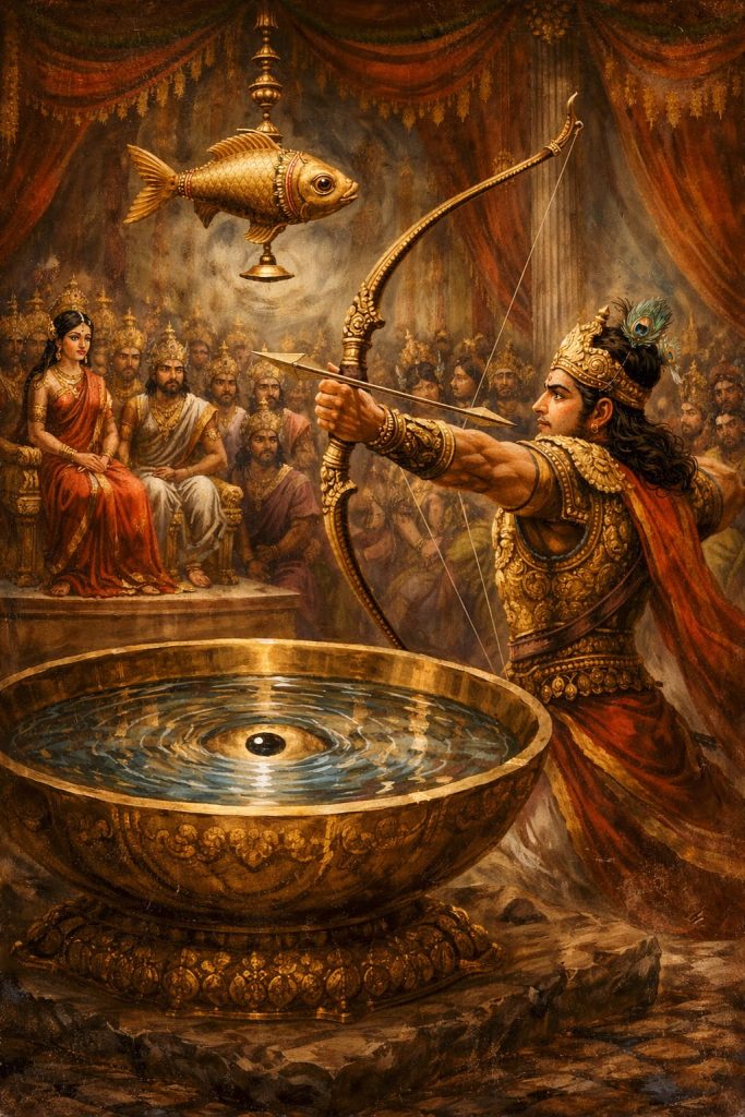 In the great epic Mahabharata, there is a famous scene. A rotating fish is placed high above. Below it, a bowl of water reflects its image. The warriors must look at the reflection and shoot the fish in the eye.